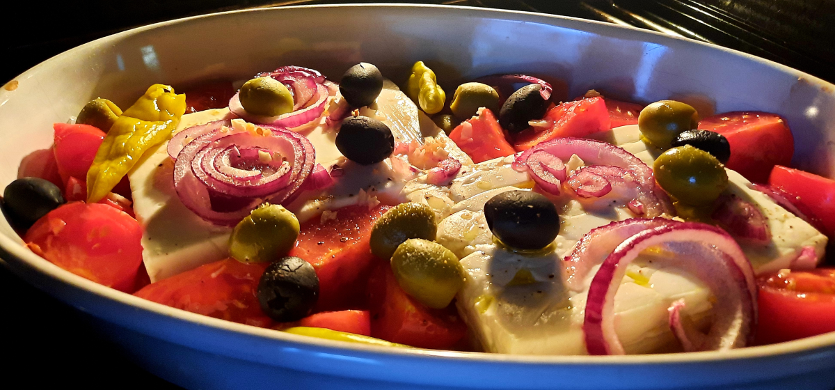 Den Fetakäse in eine feuerfeste Auflaufform geben, die Tomaten, Oliven, Peperoni und Zwiebelringe darin verteilen. Ölivenöl darüber geben und die Tomate mit Pfeffer und Salz würzen.