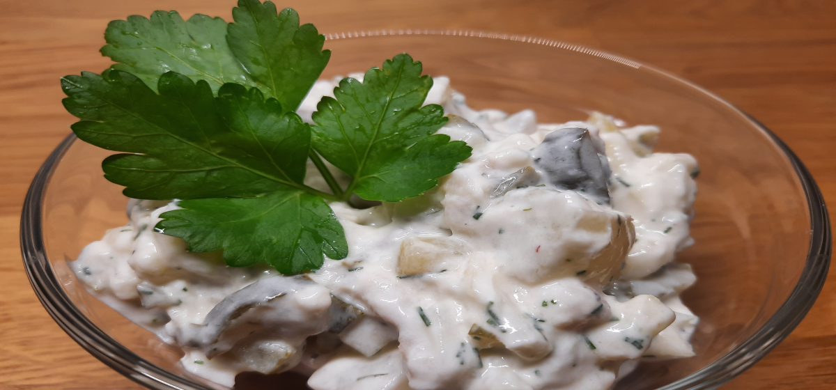 Den Fisch in mundgerechte Stücke schneiden, unter die fertige Masse geben und mit Pfeffer und Salz abschmecken. Übernacht im Kühlschrank ziehen lassen.