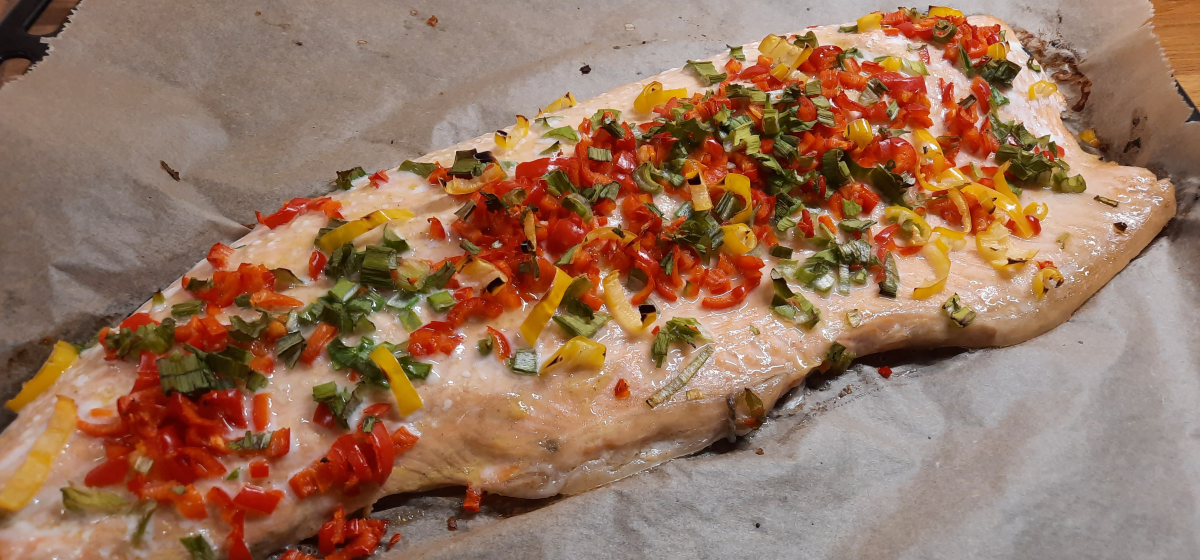 Das Gemüse in kleine Stücke schneiden und auf dem Lachs verteilen. |